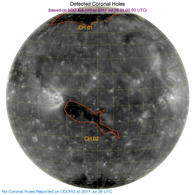 南半球東側から西寄りにかけてコロナホールがあります。こちらの影響が07/31頃から届きはじめるかも