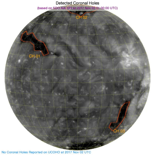 南半球西側のコロナホールは西端へ移動。こちらの影響がそろそろ届くかも。