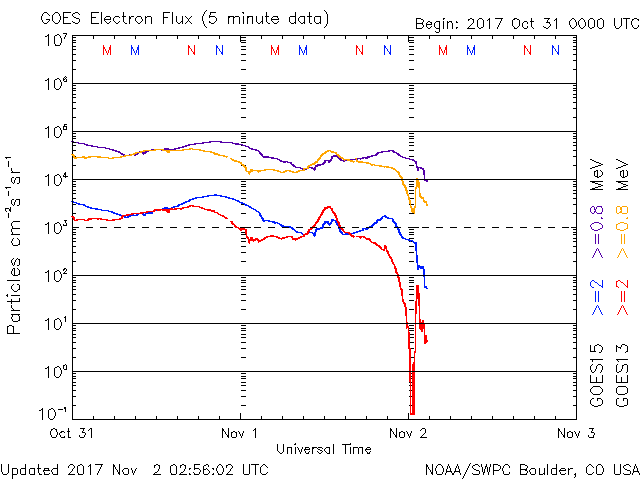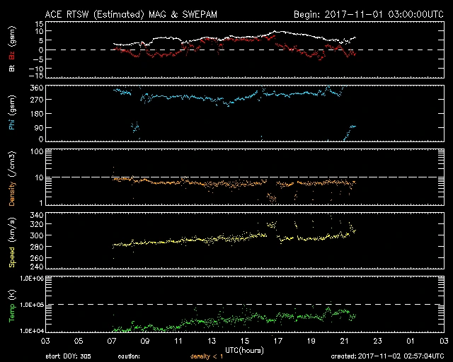 穏やかな推移でしたが、11/01 23時(UT)過ぎから急激に落ち込みはじめ、現在やや乱れの兆候があります。