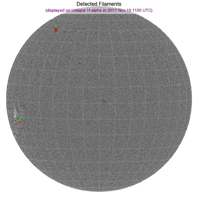 ※フィラメント:北半球東端、南はんきゅう東端に小さなフィラメントが浮いています
