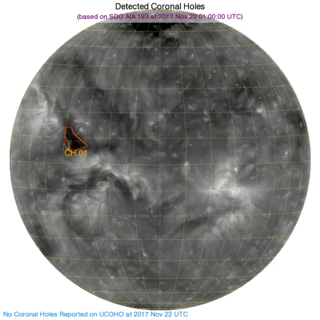 北半球西端のコロナホールはカウントされなくなりました。現在こちらの影響下