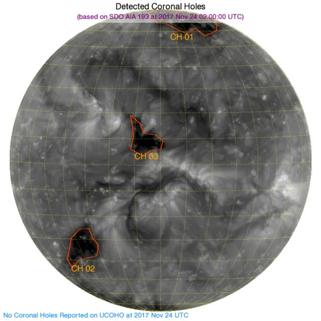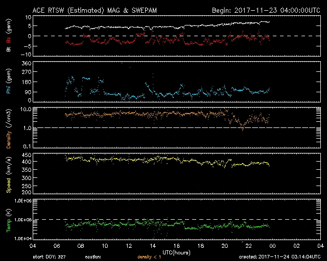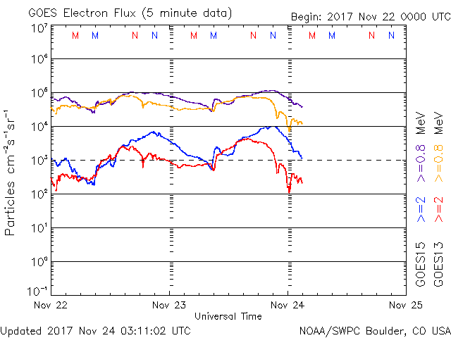 所々小さな反応があります。11/23 22時、24時(UT)頃に小さな反応があり、レベルは下降しています。