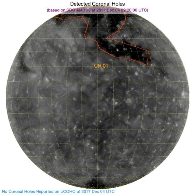 北の極から正面を経て北半球西側まで伸びるコロナホールがあります。