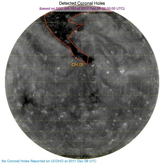 北の極から北半球正面付近にまで伸びるコロナホールがあります。