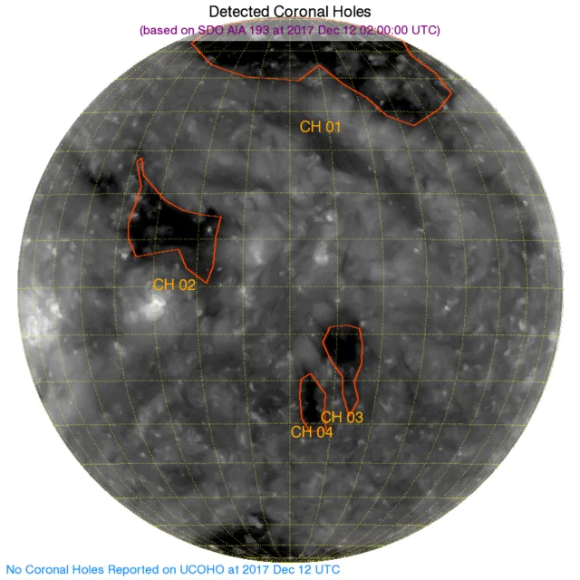北の極に大きなコロナホールがあります。こちらの影響が届き始めた模様。