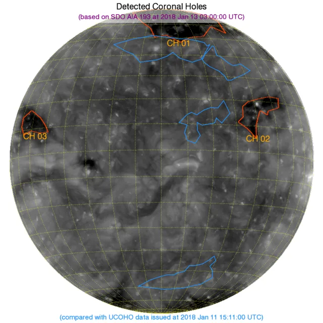 北半球西側のコロナホールは西端へ移動。こちらの影響がそろそろ届くかも