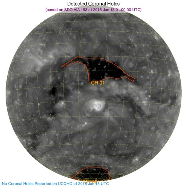 北半球ほぼ正面のコロナホールは発達しています。こちらの影響が20日くらいから届き始めるかも。