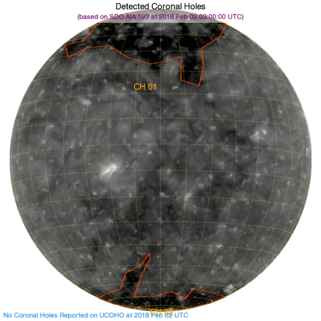 北の極と南の極にコロナホールがあります。