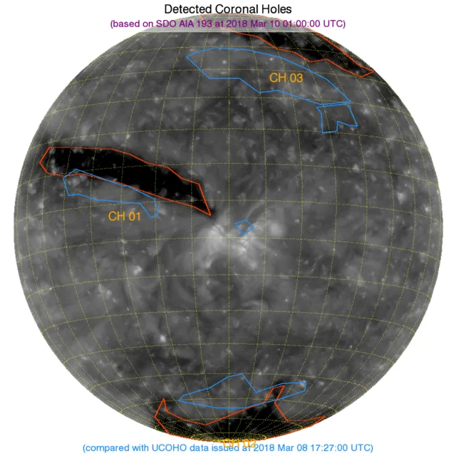 北半球東端のコロナホールが細長く発達しています。こちらの影響が13日くらいから届き始めるかも