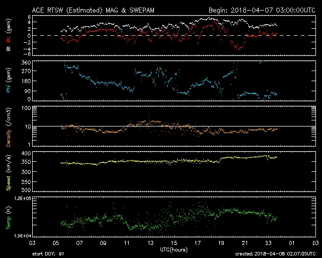330km/s前後で推移していましたが、今朝4時くらいから一段速度が上がり、370km/s前後で推移しています。