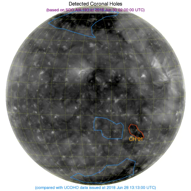 南半球西寄りのコロナホールは縮小して西側へ移動。