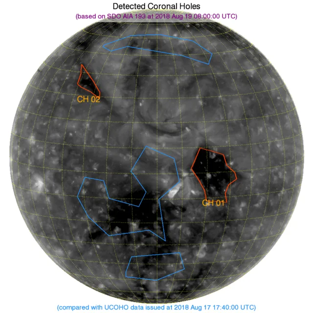 赤道付近西よりと北半球(高緯度)東側に小さなコロナホールがあります。