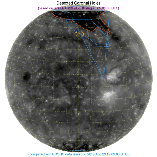 北の極から北半球(高緯度)西側にかけてコロナホールがあります。