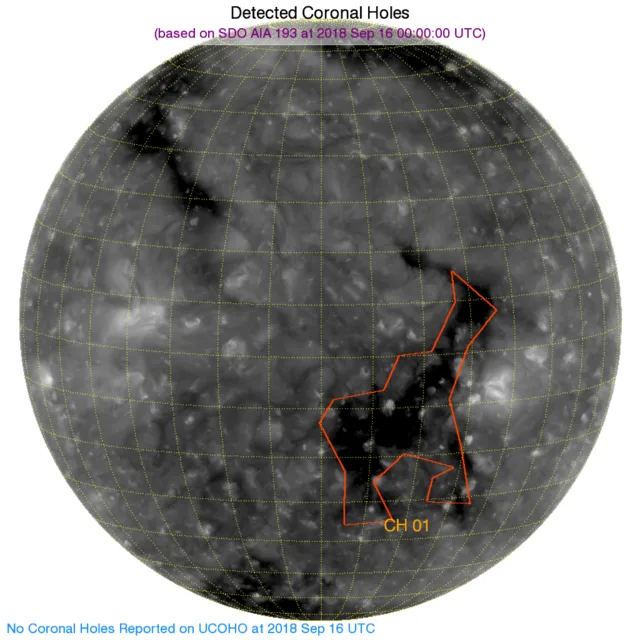 赤道を挟んで南北に長いコロナホールが西寄りにあります。