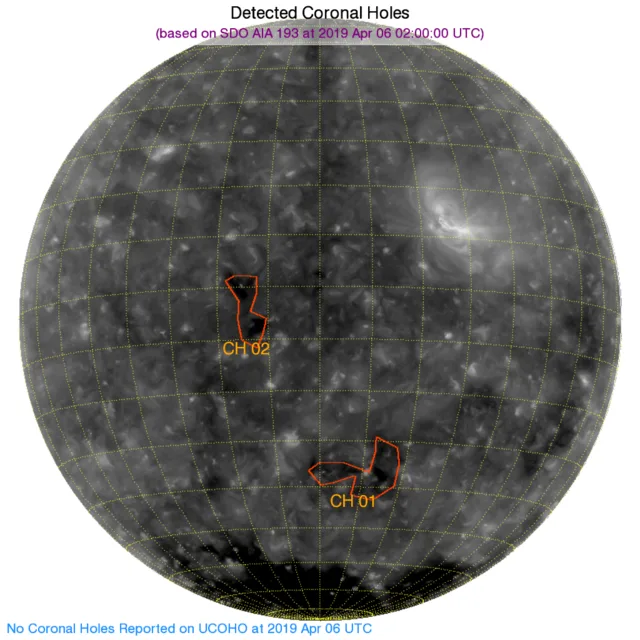 赤道付近東寄りと南半球西寄りに小さなコロナホールがあります