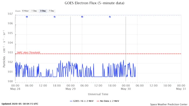 昨日北半球東端高緯度(でもまだ向こう側)の活動領域で発生した中規模太陽フレアですが、まだ向こう側の領域で発生しているので影響はほぼないようです。