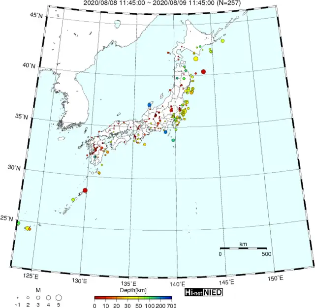 ●Hi-net日本地震分布(過去24時間)・・・小笠原のデータは掲載日がずれて反映されるようです(翌々日に掲載)
