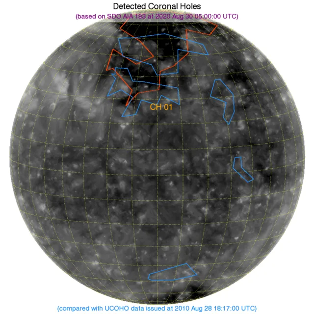 北の極から北半球高緯度にかけてコロナホールが広がっています