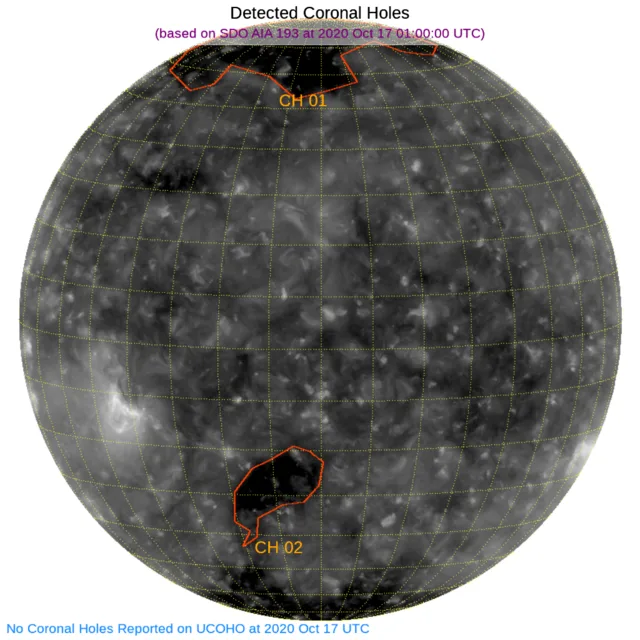 現時点で地球正面の黒点群はありません。←黒点番号が振られていない活動領域でもフレアは発生しますので、あくまで目安として捉えてください。
