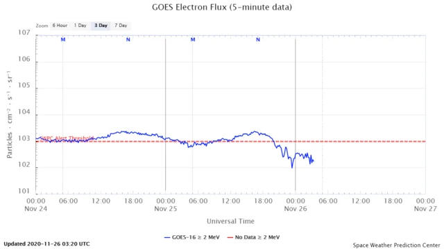 現時点で地球正面の黒点群はありません。←黒点番号が振られていない活動領域でもフレアは発生しますので、あくまで目安として捉えてください。