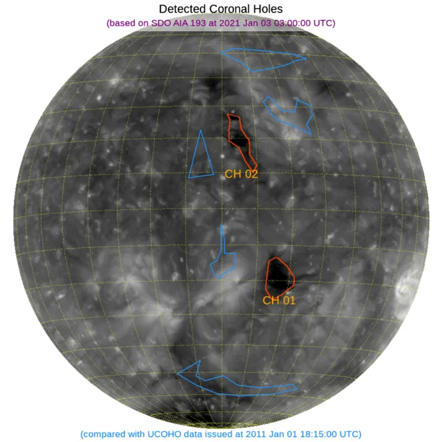 北半球中心付近と南半球西よりに小さなコロナホールがあります