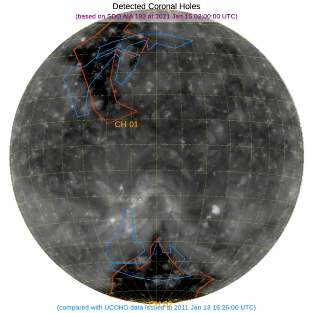 北の極から北半球東~東寄りにかけてコロナホールがあります
