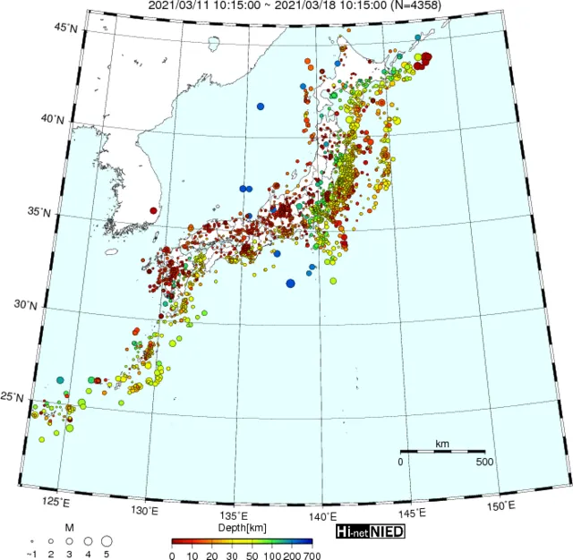 ●Hi-net日本地震分布と気象庁・・・hi-netの小笠原のデータは掲載日がずれて反映されるようです(翌々日に掲載)。掲載されないものもあるようなので気象庁の画像も付けます