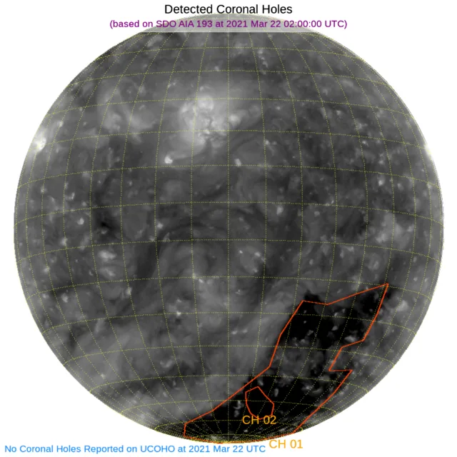 南の極から南半球西側にかけて巨大なコロナホールがあります