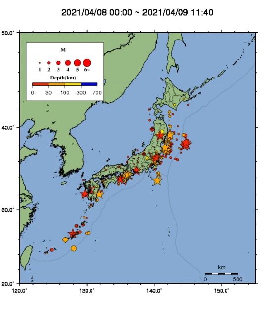 ●Hi-net日本地震分布と気象庁・・・hi-netの小笠原のデータは掲載日がずれて反映されるようです(翌々日に掲載)。掲載されないものもあるようなので気象庁の画像も付けます