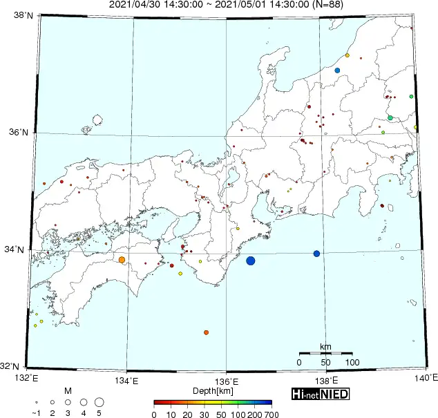 ●Hi-net日本地震分布と気象庁・・・hi-netの小笠原のデータは掲載日がずれて反映されるようです(翌々日に掲載)。掲載されないものもあるようなので気象庁の画像も付けます