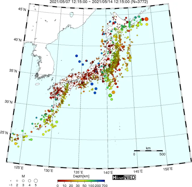 ●Hi-net日本地震分布と気象庁・・・hi-netの小笠原のデータは掲載日がずれて反映されるようです(翌々日に掲載)。掲載されないものもあるようなので気象庁の画像も付けます