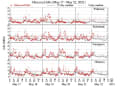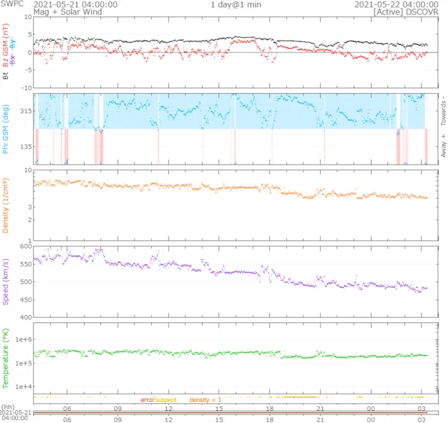 一時600km/s前後まで上がりましたが徐々に下がり、現在480km/s前後で推移しています