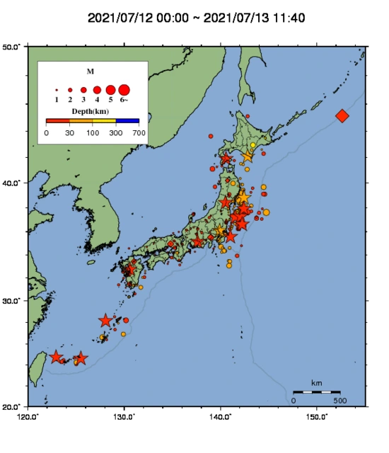 ●Hi-net日本地震分布と気象庁・・・hi-netの小笠原のデータは掲載日がずれて反映されるようです(翌々日に掲載)。掲載されないものもあるようなので気象庁の画像も付けます