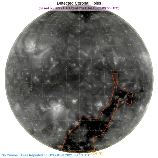 南の極から赤道付近西側までのびるコロナホールがあります。