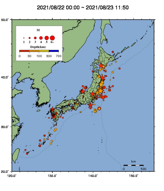 ●Hi-net日本地震分布と気象庁・・・hi-netの小笠原のデータは掲載日がずれて反映されるようです(翌々日に掲載)。掲載されないものもあるようなので気象庁の画像も付けます