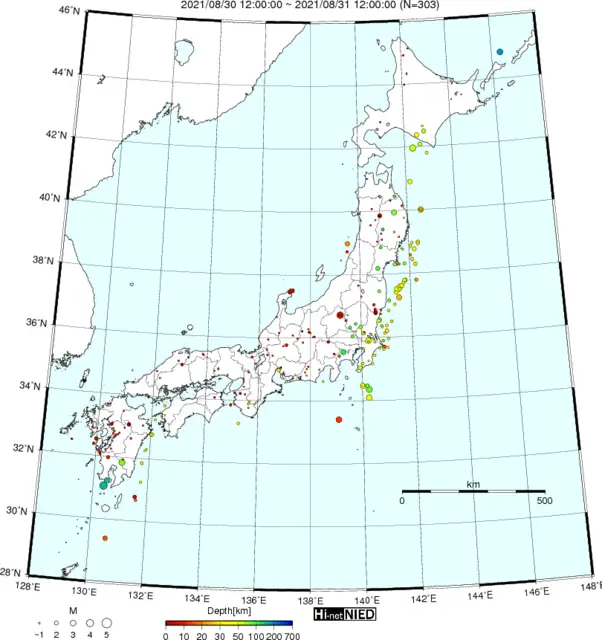 ●Hi-net日本地震分布と気象庁・・・hi-netの小笠原のデータは掲載日がずれて反映されるようです(翌々日に掲載)。掲載されないものもあるようなので気象庁の画像も付けます