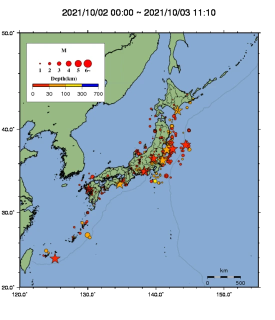 ●Hi-net日本地震分布と気象庁・・・hi-netの小笠原のデータは掲載日がずれて反映されるようです(翌々日に掲載)。掲載されないものもあるようなので気象庁の画像も付けます