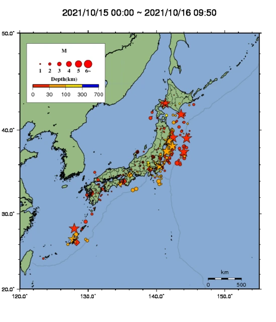 ●Hi-net日本地震分布と気象庁・・・hi-netの小笠原のデータは掲載日がずれて反映されるようです(翌々日に掲載)。掲載されないものもあるようなので気象庁の画像も付けます