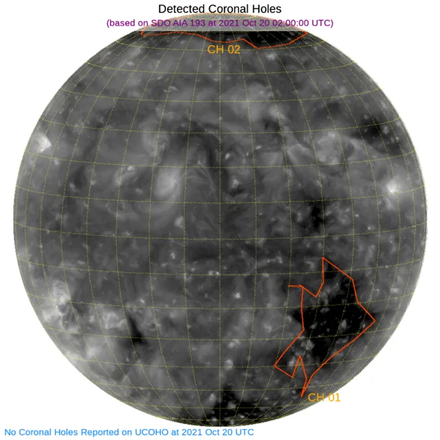北の極と、南半球西側にコロナホールがあります(南のコロナホールは大きめ)