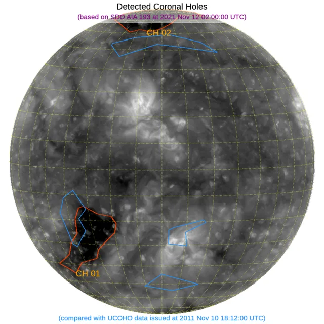 北の極と南半球東端に(やや高緯度)にコロナホールがあります
