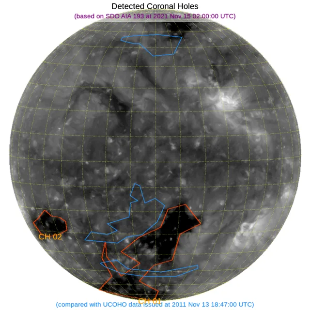 南の極から南半球中心付近まで広がるコロナホールがあります