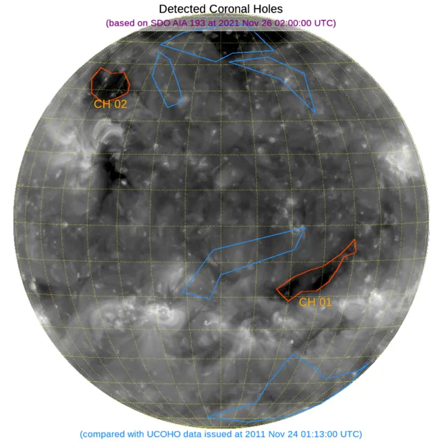 北半球(高緯度)東端、南半球西側にコロナホールがあります