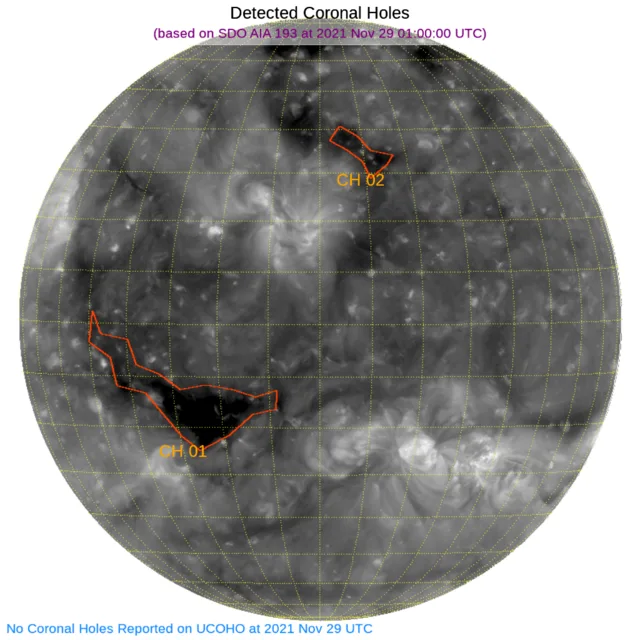 北半球(高緯度)中心付近、赤道付近やや南寄り東側にコロナホールがあります