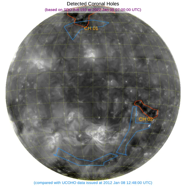 北の極と南半球(赤道付近)西側にコロナホールがあります