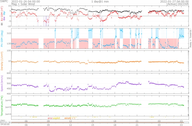 一時420km/s前後まで下がり、510km/s前後まで上がりました。現在は460km/s前後で推移しています