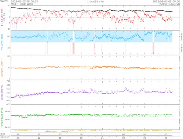 480km/s前後で推移していましたが徐々に上がり、一時610km/s前後まで上がりました。現在560km/s前後で推移しています