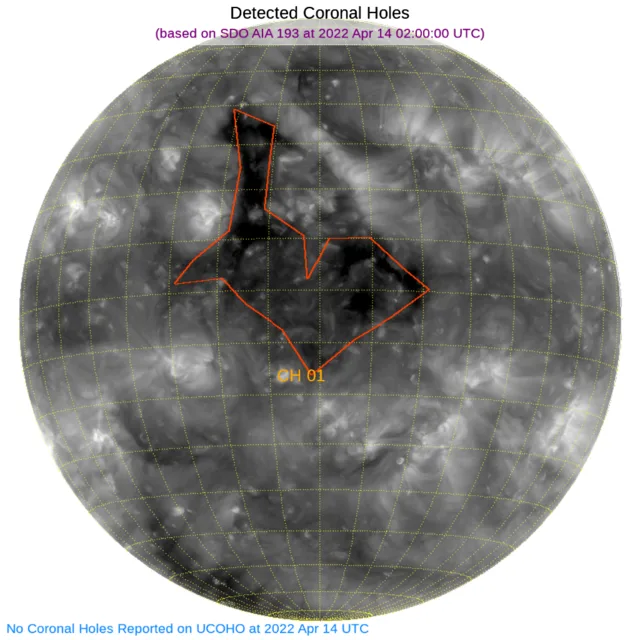 中心付近~北半球東側にかけて広がる大き目なコロナホールがあります