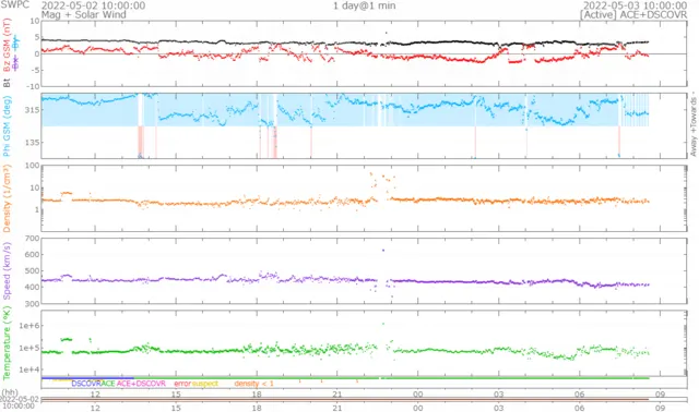 一時600km/sを超える突風が吹いたようですが、420km/s前後で推移しています