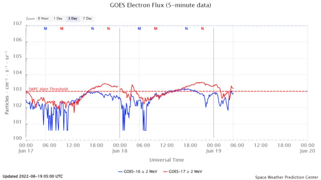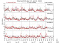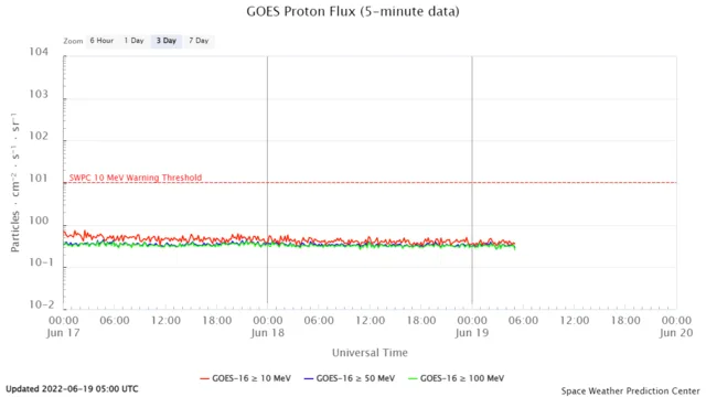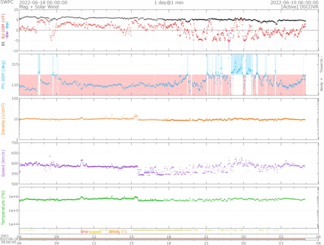 時々600km/sを超える太陽風が吹いていますが、引き続き590km/s前後で推移しています