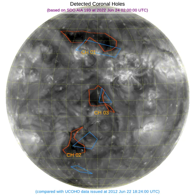 北半球・赤道付近・南半球の中心付近にコロナホールがあります